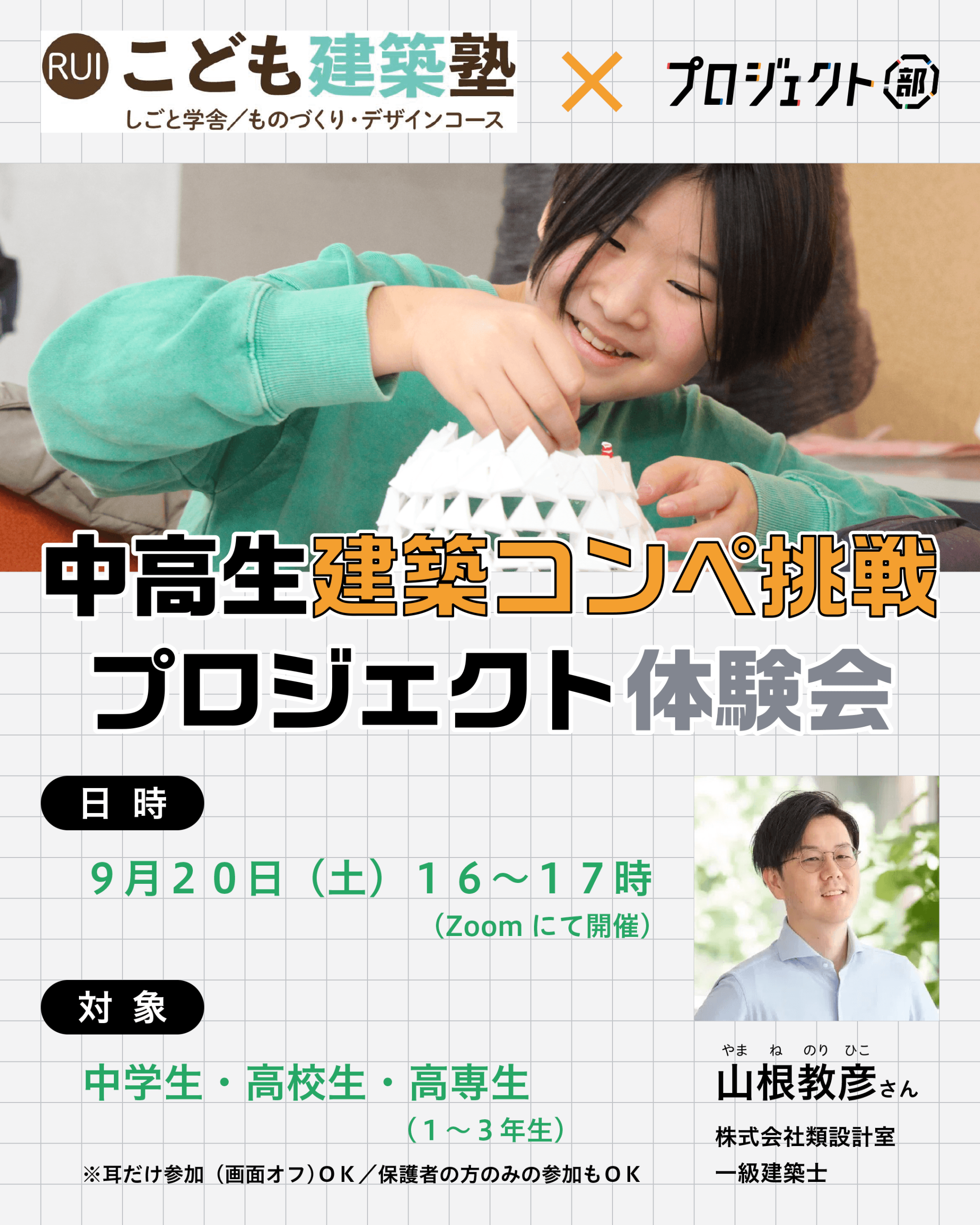このプロジェクトは、類設計室とエイスクール主催の10代向け全国建築コンペへの挑戦をサポートするオンラインプログラムです。全国の中高生や大学生のメンターとオンラインでつながりながら、建築の発想法から模型づくり、プレゼンまでを体系的に学びます。